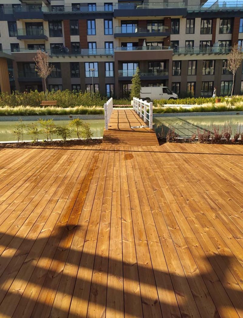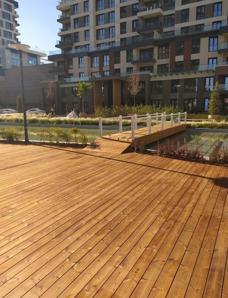 Alta Resistencia a la Humedad: El tratamiento de la madera es el argumento de venta clave. Se trata de una madera de exterior (decking) con el espacio adecuado entre tablones para un drenaje rápido y eficiente, evitando la acumulación de agua y prolongando la vida útil de la estructura.