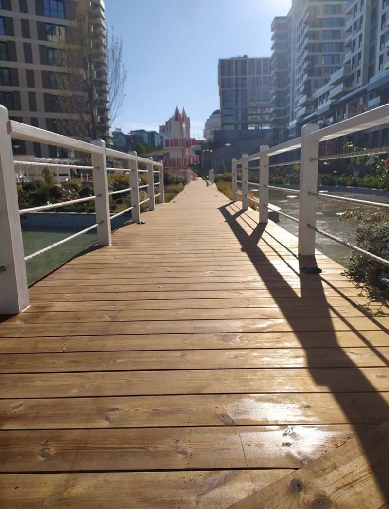 Tablero Elevado y Rampa: La pasarela se construye con tablones horizontales que se elevan suavemente del suelo a través de pequeñas rampas. Esta elevación crea la sensación de «flotar» o de caminar sobre el agua, lo que es un gran atractivo experiencial.